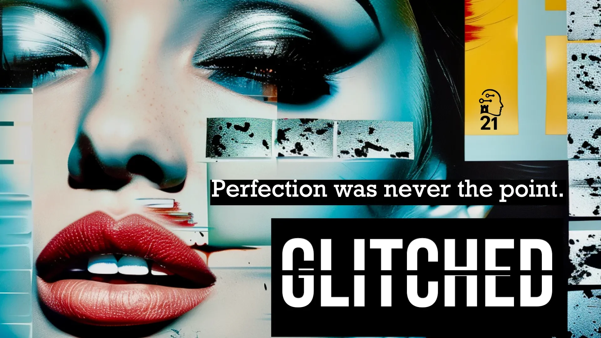 Glitched — a surreal digital portrait showing a woman’s face broken into glitch-style fragments and layered tiles. The image mixes sharp red lips, metallic eye makeup, and abstract textures, creating a futuristic and cinematic atmosphere. The artwork explores distortion, identity, and the beauty of imperfection.