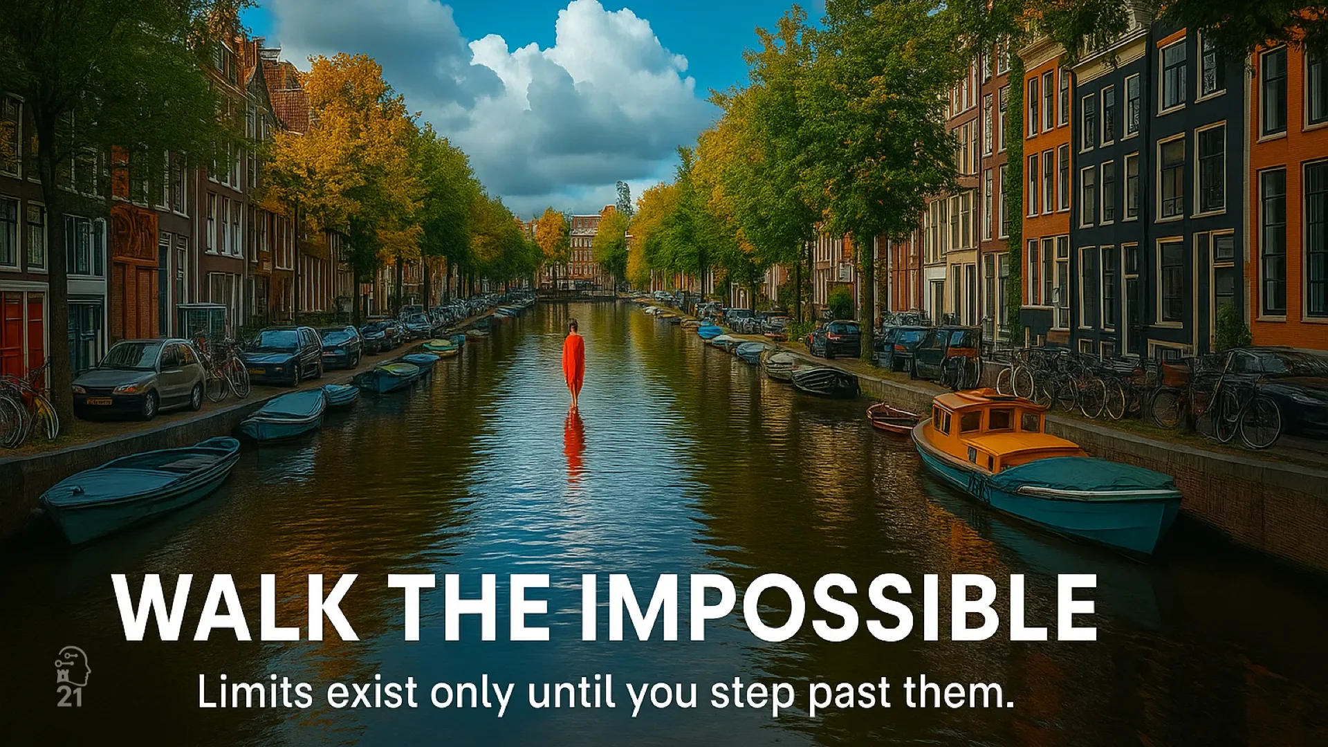 The city around this canal stands as history. Solid, unmoving. But the figure in red changes everything. That’s what it means to walk the impossible: you don’t erase the limits; you redefine them.